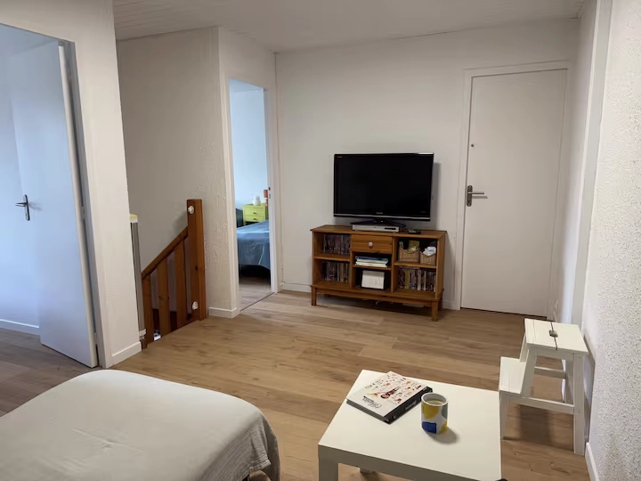 Cette maison mitoyenne est composée au RDC d’un séjour/salle à manger avec cuisine équipée ouverte sur le séjour et d’un cellier, d’une chambre avec un lit double (160), d’une salle de bain et d’un WC séparé.